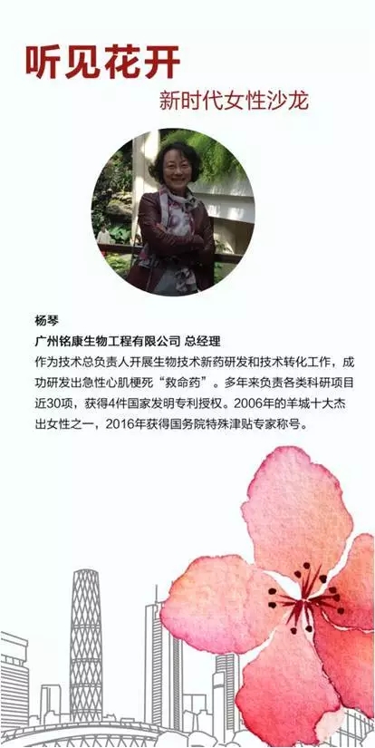 活動(dòng)現(xiàn)場(chǎng)氣氛熱烈,座無(wú)虛席。女企業(yè)家們暢所欲言,通過(guò)分享創(chuàng)業(yè)經(jīng)歷和感想,以及事業(yè)和家庭上的體驗(yàn),表達(dá)她們對(duì)新時(shí)代女性的看法和期望。作為嘉賓之一,我司楊琴女士向觀眾道出自己軍人出身創(chuàng)業(yè)研發(fā)急性心肌梗死藥物銘復(fù)樂(lè)的初衷:想縮短我國(guó)生物技術(shù)藥物研究及溶栓治療水平與國(guó)際先進(jìn)水平的差距,也是為了讓我國(guó)心腦血管患者能夠用上新型溶栓藥。在“如何創(chuàng)造更利于女性發(fā)展的職場(chǎng)”話題中,楊琴女士認(rèn)為女性的認(rèn)真細(xì)心與堅(jiān)韌不拔的品質(zhì)在生物醫(yī)藥研發(fā)上更能發(fā)揮作用。銘復(fù)樂(lè)作為迄今唯一可單次靜脈推注的溶栓藥,具有使用方便、適合急救,可院外溶栓的顯著優(yōu)勢(shì),但因其為高難度、高復(fù)雜度基因重組藥物的典型代表,必須使用哺乳動(dòng)物細(xì)胞表達(dá)生產(chǎn),研發(fā)團(tuán)隊(duì)艱苦研究開(kāi)發(fā)了15年才終于實(shí)現(xiàn)銘復(fù)樂(lè)的產(chǎn)業(yè)化并正式上市。在問(wèn)及心目中最能代表理想女性的花時(shí),楊琴女士回答木棉花,不僅因?yàn)樗菑V州市市花,更因?yàn)椤吨孪饦?shù)》中木棉要以樹(shù)的形象與橡樹(shù)站在一起,女性就要像木棉一樣,自信自立自強(qiáng),世界才會(huì)更加美好!