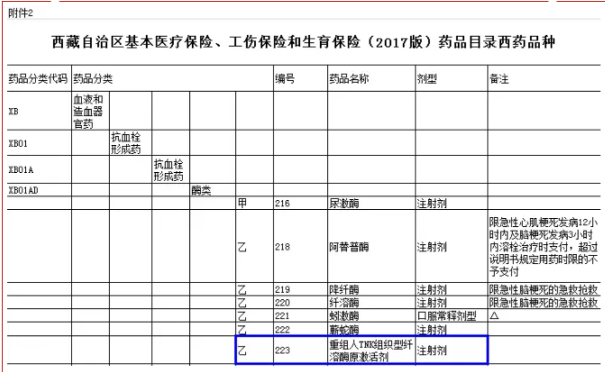銘復(fù)樂(重組人TNK組織型纖溶酶原激活劑)進(jìn)入了西藏自治區(qū)基本醫(yī)療保險(xiǎn)、工傷保險(xiǎn)和生育保險(xiǎn)(2017版)藥品目錄西藥品種,藥品分類代碼為XB01AD;藥品分類為血液和造血器官藥,抗血栓形成藥,酶類,乙類;編號為223。
